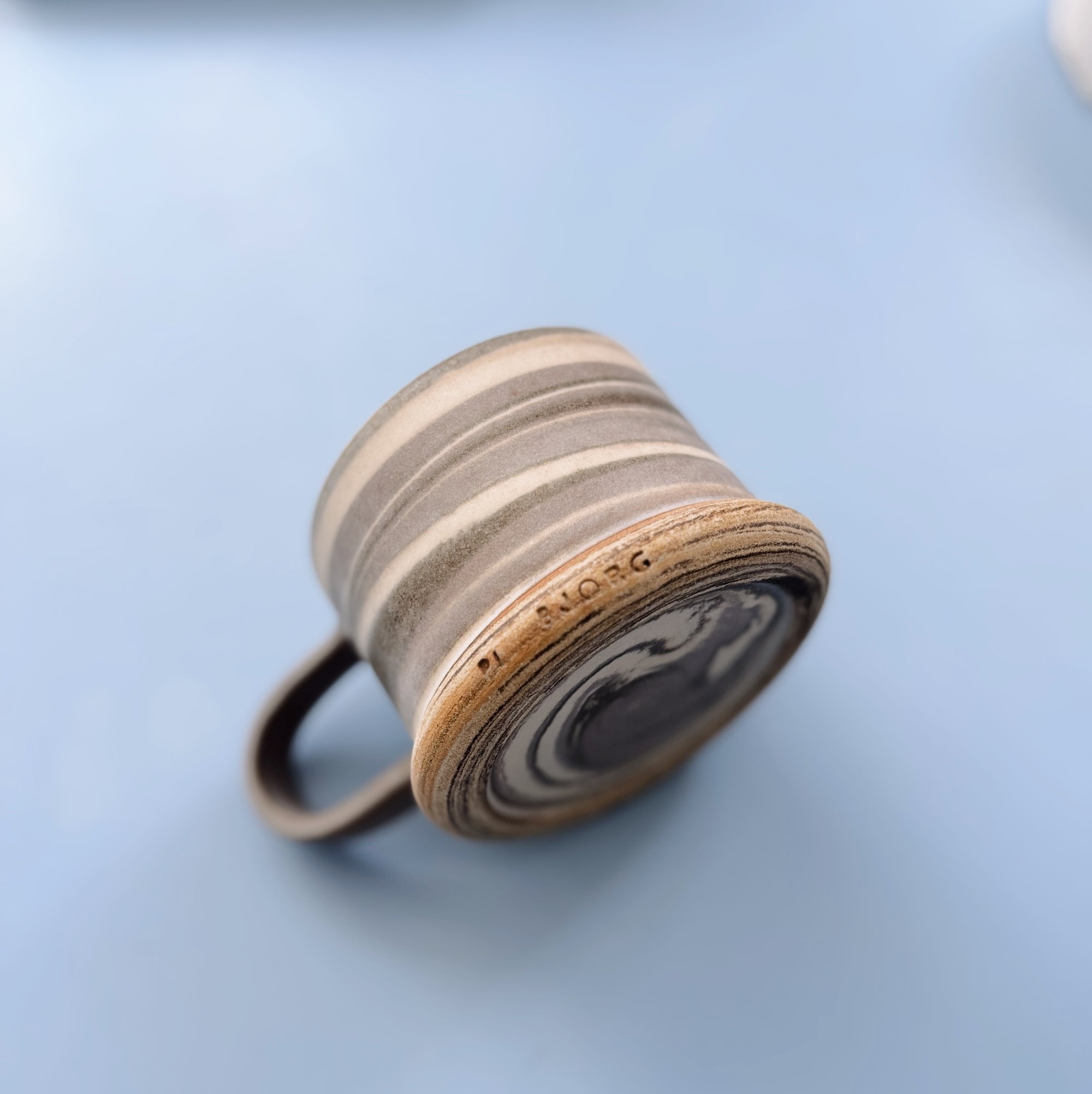 This cup is thrown from 4 types of stoneware clay, in 4 different nuances. The cup is glazed In a mat transparent glaze, with a sanded base that your fingers can feel and linger on during use.