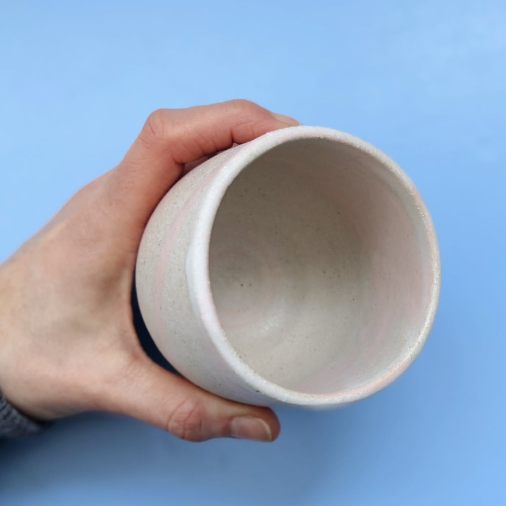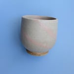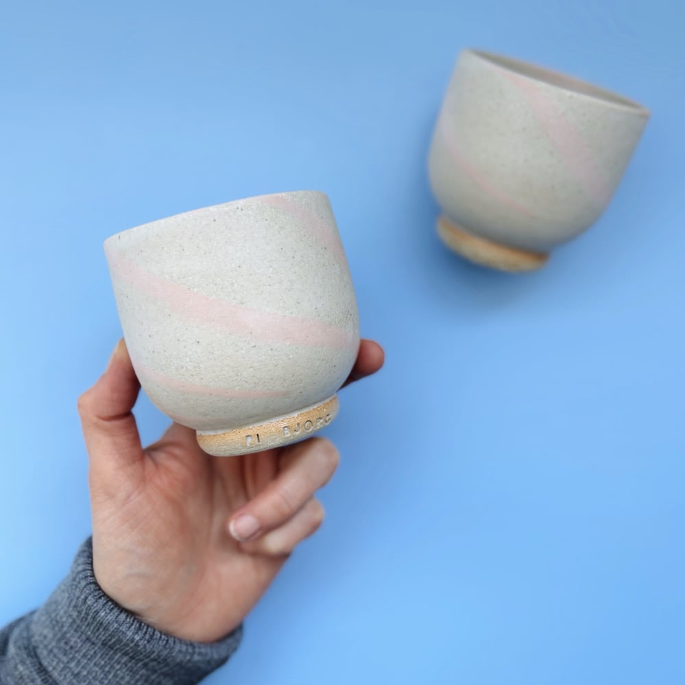 A hand thrown stoneware tumbler, with a mixed in light pink clay to give it a marbled look.